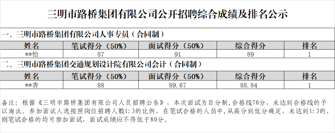 根據(jù)《市路橋集團(tuán)有限公司人員招聘公告》,現(xiàn)將市路橋集團(tuán)有限公司公開招聘工作人員綜合成績(jī)及排名情況公示如下:
