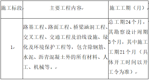 2.3工期要求:總工期24個(gè)月,其勘察設(shè)計(jì)周期3個(gè)月,其中施工工期21個(gè)月(具體開工時(shí)間以開工令為準(zhǔn))。