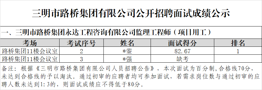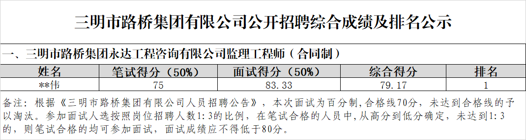 根據(jù)《三明市路橋集團(tuán)有限公司人員招聘公告》,現(xiàn)將市路橋集團(tuán)有限公司公開招聘工作人員綜合成績及排名情況公示如下: